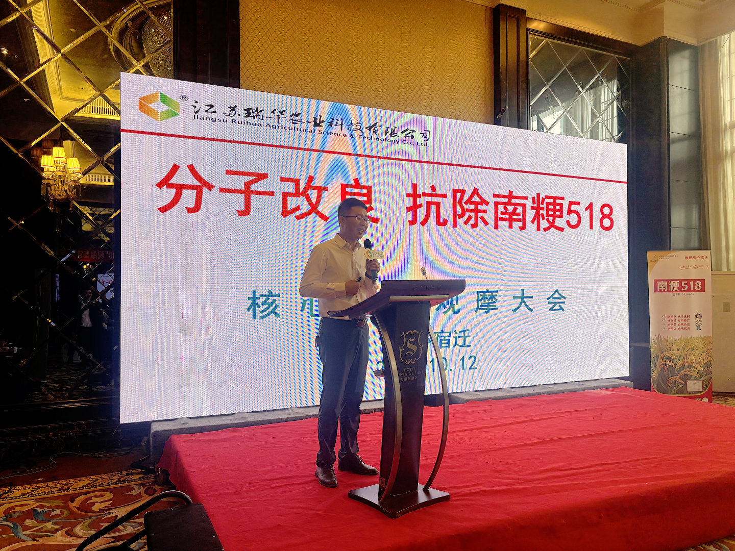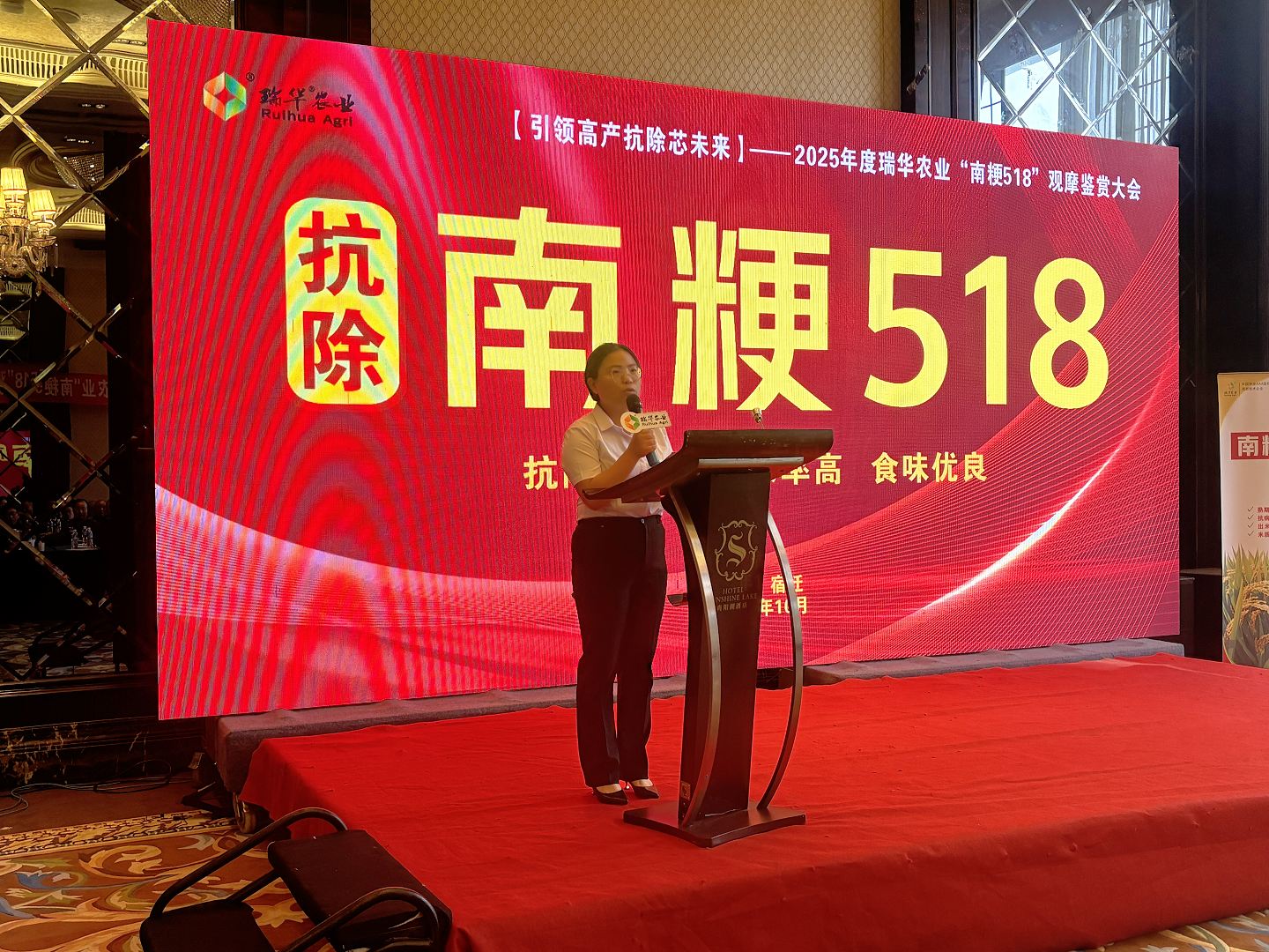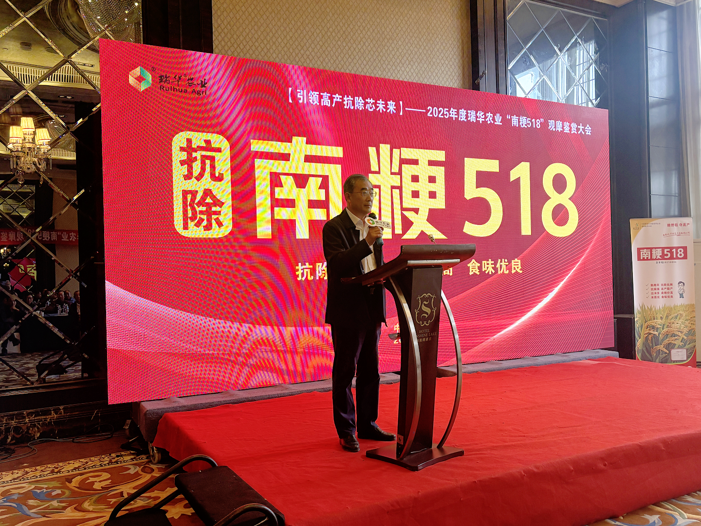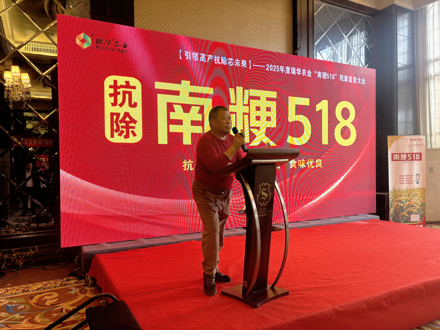 【概要描述】2025年10月11-12日,江蘇瑞華農業科技有限公司在江蘇省宿遷市舉辦南粳518田間觀摩鑒賞大會,獲得參會者好評。 11日下午,工作人員為客戶辦理入住手續與分配酒店房間。當晚,歡迎晚宴在開元大酒店舉辦。 12日上午,由市場部經理丁帥為大家介紹南粳518的特征特性,隨后帶領大家對比觀察初代南粳518與目前市場上在售品種,充分展現了現在南粳518的強抗倒性。與會人員在田間進行合照后,總經理夏中華結合田間實際情況,講解了南粳518的選育過程。 由鄭雅月經理對田間觀摩進行總結,并宣布室內會議開始。市場部經理丁帥從南粳518“優良食味、中熟中粳”的特點及“抗病強、熟期早、產量高、米質優、抗倒強”五大推廣優勢出發,對該品種進行詳細介紹,同時講解了抗除系除草劑使用指導意見及注意事項。接著,灌南縣經銷商陳克震分享了去年機插秧種植經驗,他提到在正常施肥的情況下,南粳518的畝產量達到了1950斤。 最后,由總經理夏中華致辭。他表示,今年是氣候多災多難的一年,小麥、玉米、水稻都遭受了不同程度的惡劣環境影響,這也成為檢驗品種抗性的重要考驗。夏總還詳細介紹了南粳518的研發與篩選歷程,并向大家承諾,后續會引進雜交稻品種,填補公司在該品類的空白。同時,也希望和大家加強合作,歡迎大家后續抽時間前往試驗站考察。 此次南粳518觀摩大會的成功舉辦,不僅是對瑞華農業產品實力的肯定,也是對經銷商和種植大戶合作信心的體現。瑞華農業將繼續深耕科技創新,為農民提供更優質的產品和服務。